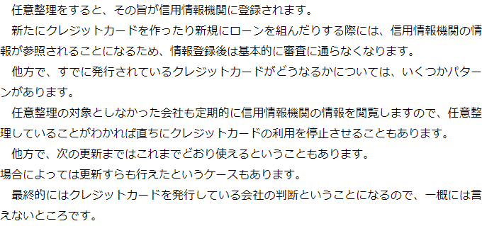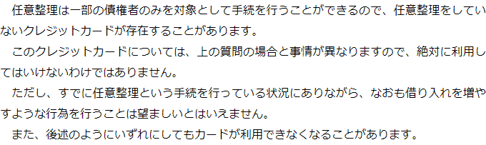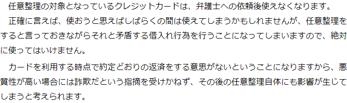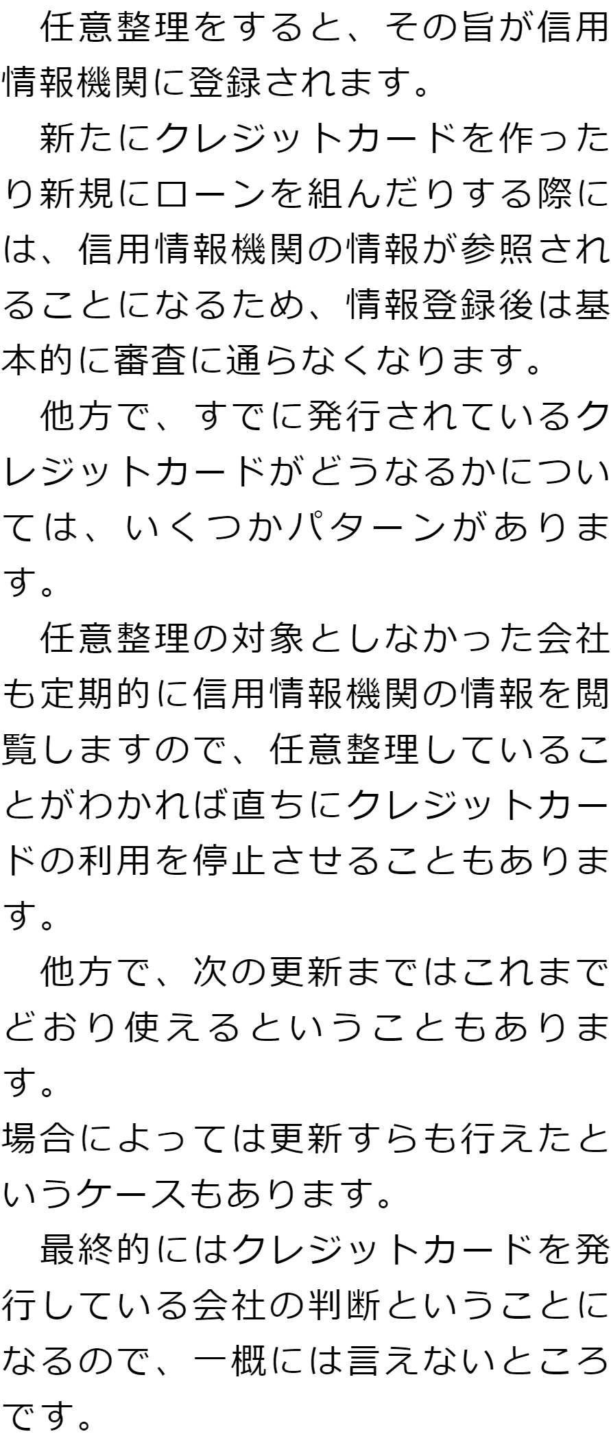 Q任意整理の対象としなかったクレジットカードであれば、使っても大丈夫ですか?AQ任意整理の対象としなかったクレジットカードは使えなくなるのでしょうか?A お役立ち情報・Q&A(目次)お役立ち情報・Q&Aトップお役立ち情報任意整理のプール金とはQ&A任意整理をした場合のクレジットカードに関するQ&A 受付時間 平日 9時~21時、土日祝 9時~18時 夜間・土日祝の相談も対応します (要予約) 所在地 〒111-1111 ●町●●建物● 0120-41-2403 お問合せ・アクセス・地図
