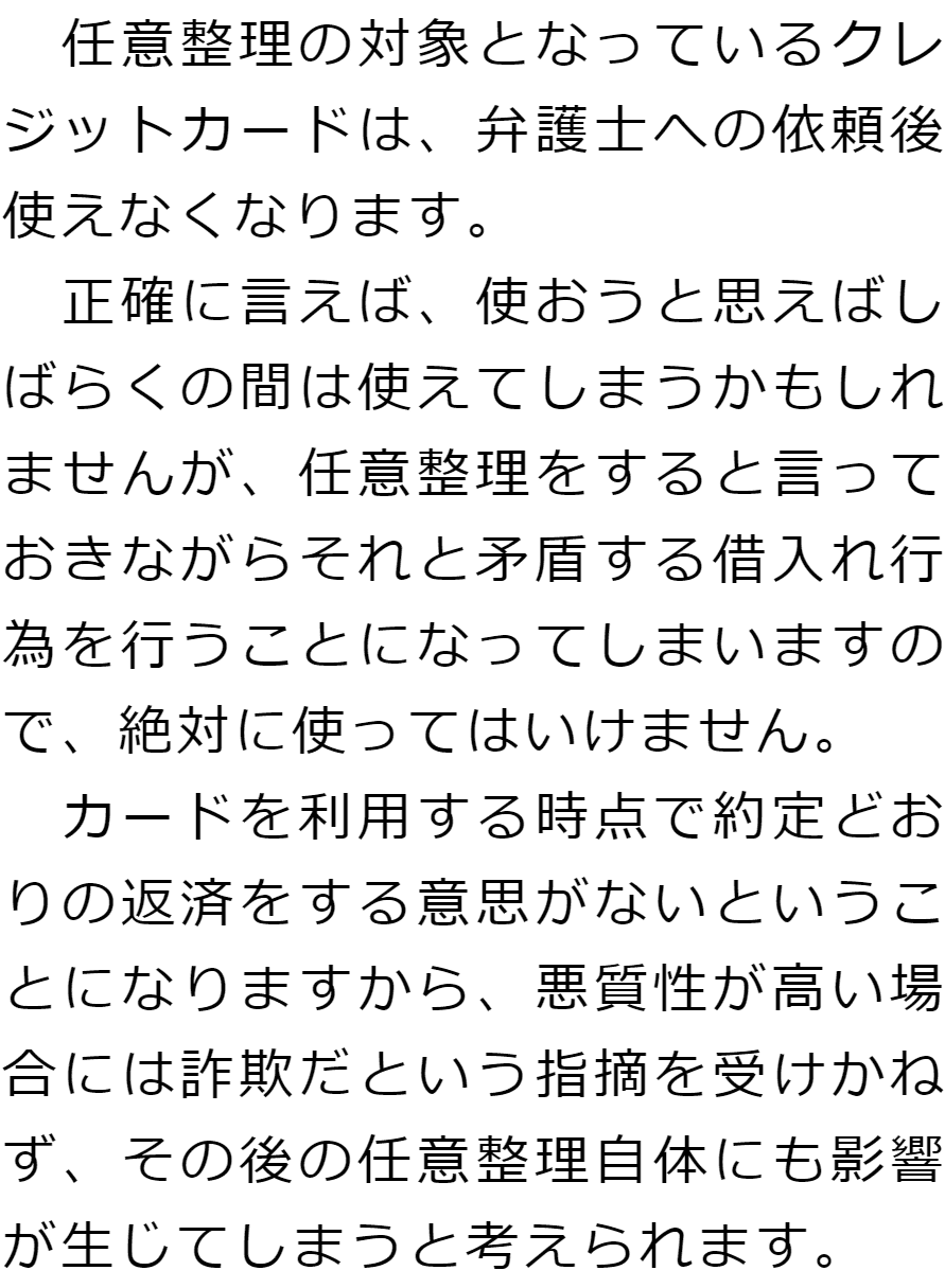 トップお役立ち情報・Q&AQ&A任意整理をした場合のクレジットカードに関するQ&A 階層構造▼ お役立ち情報・Q&A(目次) 任意整理をした場合のクレジットカードに関するQ&AQ任意整理の対象としたクレジットカードは使えなくなるのですか?Q任意整理の対象としなかったクレジットカードであれば、使っても大丈夫ですか?Q任意整理の対象としなかったクレジットカードは使えなくなるのでしょうか? Q任意整理の対象としたクレジットカードは使えなくなるのですか?AQ任意整理の対象としなかったクレジットカードであれば、使っても大丈夫ですか?AQ任意整理の対象としなかったクレジットカードは使えなくなるのでしょうか?A お役立ち情報・Q&A(目次)お役立ち情報・Q&Aトップお役立ち情報任意整理のプール金とはQ&A任意整理をした場合のクレジットカードに関するQ&A 受付時間 平日 9時~21時、土日祝 9時~18時 夜間・土日祝の相談も対応します (要予約) 所在地 〒111-1111 ●町●●建物● 0120-41-2403 お問合せ・アクセス・地図