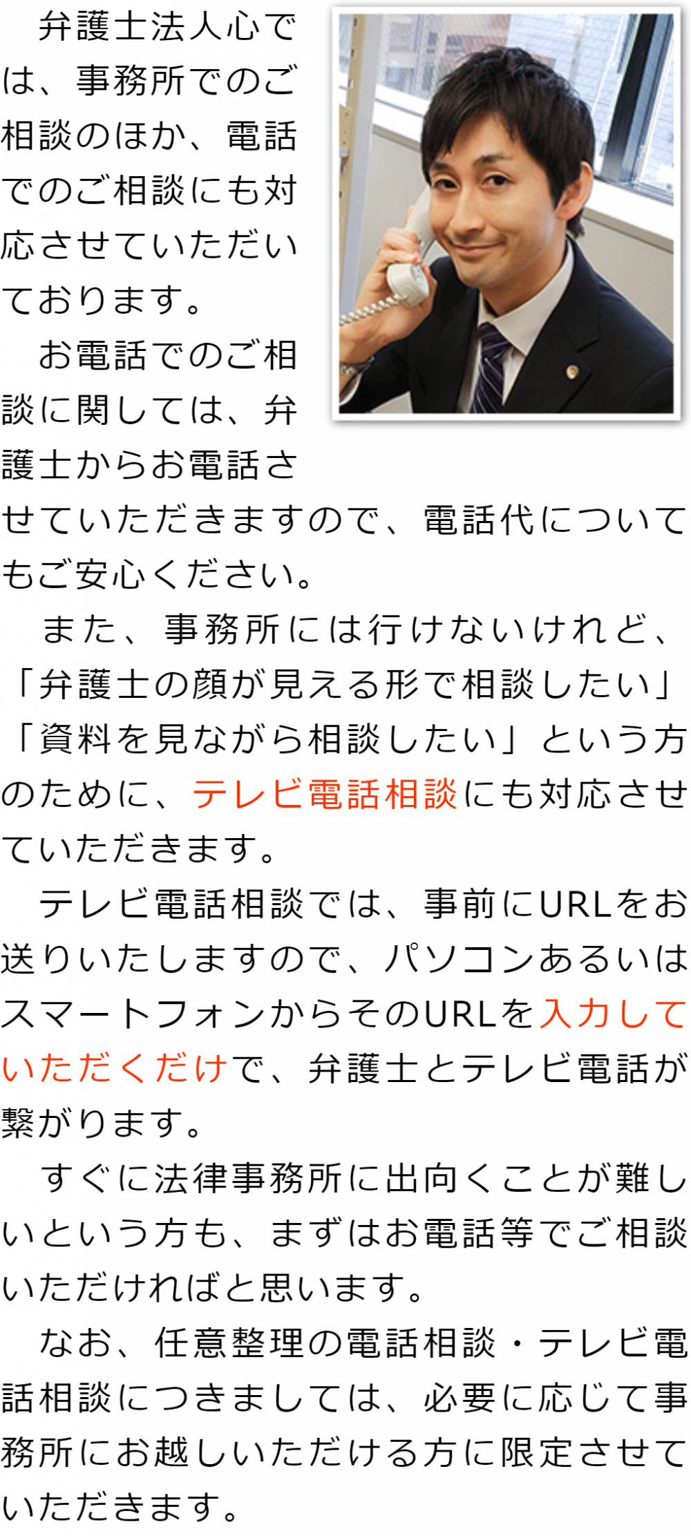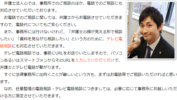 トップその他電話・テレビ電話相談について 階層構造▼ その他(目次) 電話・テレビ電話相談について その他(目次)その他トップ共通バナー元※削除不可新着情報(心グループニュース)電話・テレビ電話相談について代表メッセージお客様相談室費用(詳細)費用の安さにこだわる理由関連リンクお役立ちリンクプライバシーポリシー 受付時間 平日 9時~21時、土日祝 9時~18時 夜間・土日祝の相談も対応します (要予約) 所在地 〒111-1111 ●町●●建物● 0120-41-2403 お問合せ・アクセス・地図